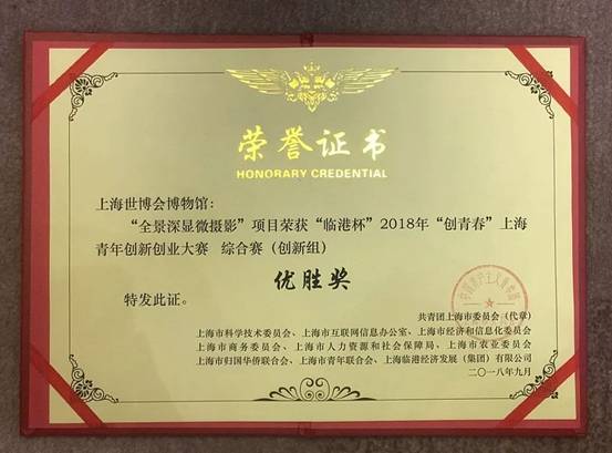 上海世博会博物馆WE创新工作室的《全景深显微摄影》项目荣获2018年“创青春”上海市青年创新创业大赛创新组综合赛的优胜奖!