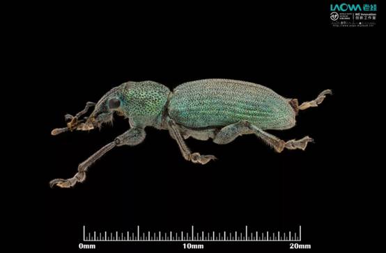 本次拍摄使用全画幅单反及Laowa FF100MM f2.8,被拍摄物为象甲科多露象属Polydrosus sp,是目前首个超过1倍光学倍率进行360度拍摄的全景深作品。