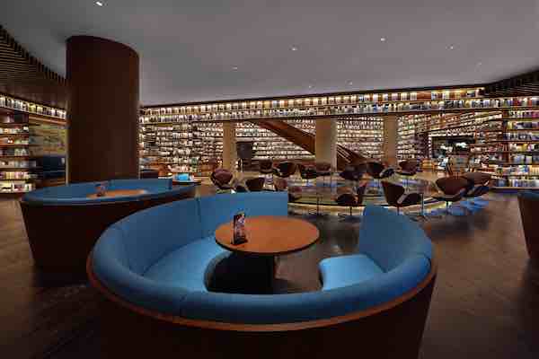 威士忌吧对面,是仿造大学图书馆打造的阅读区。