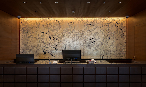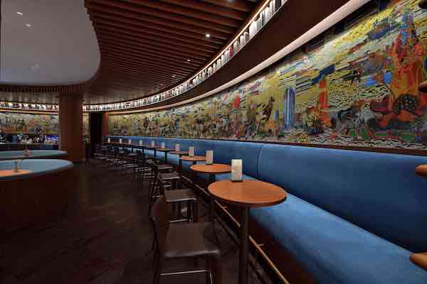 咖啡吧的后墙以浮世绘的手法描绘了西安作为丝绸之路的东方起点,连接东西方文化交流的绮丽长卷。