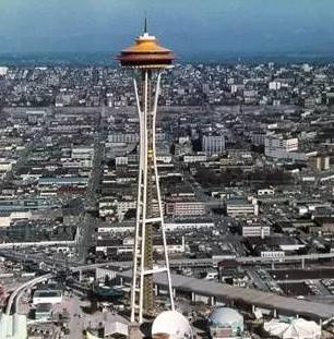 突飞猛进的世界转眼间又把历史改写成了“太空时代”。1957年10月4日,苏联发射了第一颗人造地球卫星,美国随后急起直追,“太空竞赛”由此拉开序幕。1962年西雅图世博会的主旨是“太空时代的人类”,格雷厄姆公司设计的标志性建筑“太空针”就充分体现了时代精神。拔地而起的3支钢架凌空会合又彼此张开,轻轻托举着一只硕大的“飞碟”,充满了神奇浪漫的科幻气息。“太空针”高184米,“飞碟”直径42米,成为密西西比河西部首屈一指的地标。