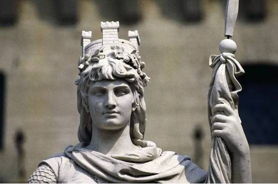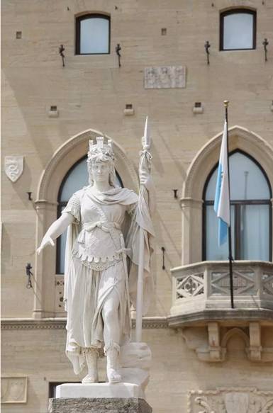自由女神高高立于基座之上,腰佩长剑,脚蹬战靴,头上戴着象征圣马力诺的要塞冠冕。她左手握住一柄长矛,右手前伸,左脚也往前迈了一步,似乎正要走上战场,颇有点希腊神话里智慧女神雅典娜的气度。