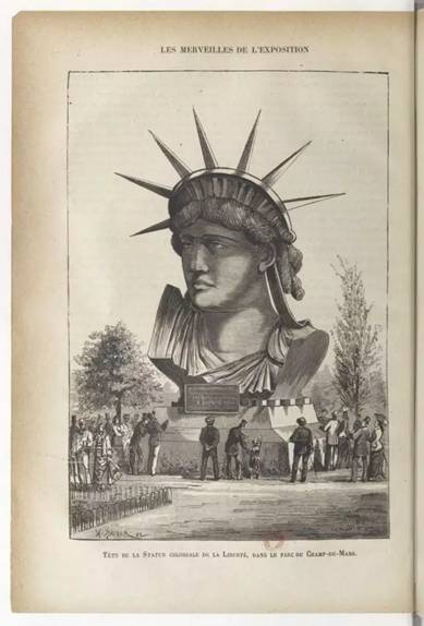 1878年巴黎世博会上,刚刚完成的“自由女神”头部在特洛卡蒂诺宫展出,游人纷纷爬进她高达的华冠,从25个窗户中纵览展区。
