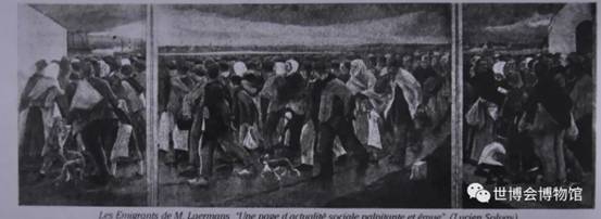 终于有一个官方的展览能把画大方地挂成一排,而不是像往常那样摞在一起,以往那些所谓的展览只能称为杂货市场。经过评委会的严格审查,仅有四百五十幅作品入选。其中《移民》是世博会上很少见的历史题材画,它以真实而感人的笔触描摹社会现实的一页。