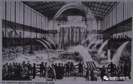 世博会的副馆用来陈列水力机器,馆内有一个长160英尺、宽60英尺的水库,水深10英尺。以后,水库里还会装上水力机械,可终日不停运转。在水池的最南边有一个人工瀑布,高35英尺,宽40英尺,由水泵带动。
