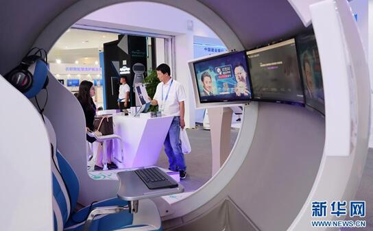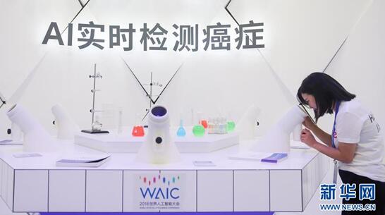 参观者在大会现场体验“AI实时检测癌症”设备。新华社记者丁汀摄