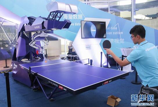 工作人员在大会现场演示与机器人打乒乓球新华社记者丁汀摄
