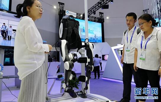 工作人员(左)在大会现场向参观者介绍一款外骨骼机器人。新华社记者方喆摄