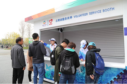 4月20日,北京世园会园区进行10万人全负荷压力测试,共有540名园区志愿者上岗,分别来自北京邮电大学世纪学院在校生志愿者和延庆团区委的社会招募志愿者,参与近130个岗位点的园区八大类运行管理协助和游客服务工作。