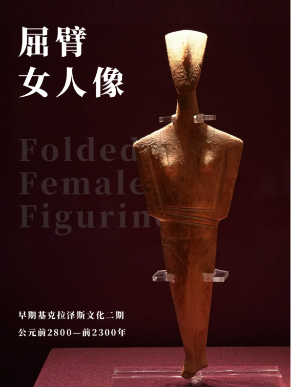 双手交叉于胸前,是基克拉泽斯文明早期人物雕像最常见造型,图中展品是其中的“德卡提斯玛塔类型”。平整的面部、三角形头部、宽阔瘦削的双肩几乎笔直的双腿以及三角形的耻骨,这种抽象主义风格甚至影响了20世纪艺术家。