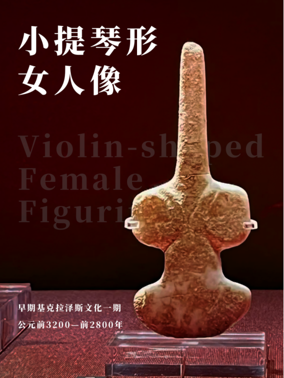 这类雕像因形似小提琴而得名,是基克拉泽斯文明早期特有的器物类型,长棒状的突出部分表示头部和颈部,人物双臂收于胸下,两侧宽的凹槽代表腰部,底部刻画有三角形耻骨。推测当时的人们可能随身携带参加祭祀仪式。