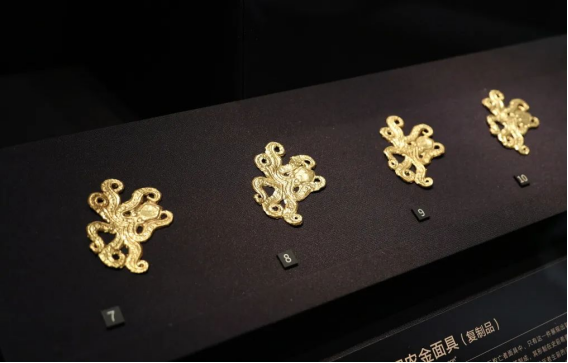采用剪裁工艺的金牌饰,描绘了运动中的章鱼,每只章鱼均有7只触手和圆形的吸盘,来自海洋世界的生物图案,在米诺斯文化和迈锡尼文化中深受欢迎。