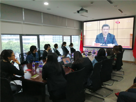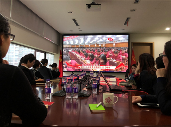 同一时刻,在世博会博物馆党总支书记蒋莎的带领下,馆内的共青团员们、青年朋友们、同志们集聚一堂,在线同步学习习总书记的重要讲话。