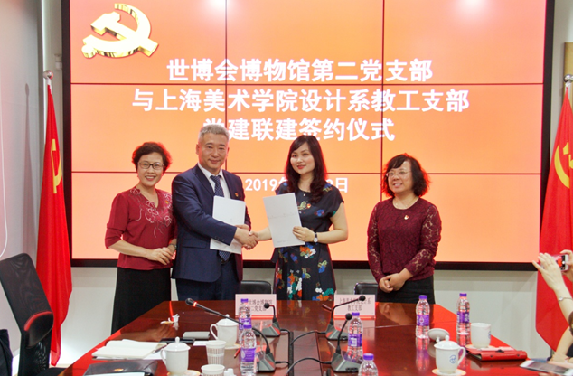世博会博物馆党总支书记蒋莎及第二党支部书记、副馆长邹俊,上海美术学院党委书记陈静、设计系教工支部书记赵蕾及双方党员代表参加签约仪式。
