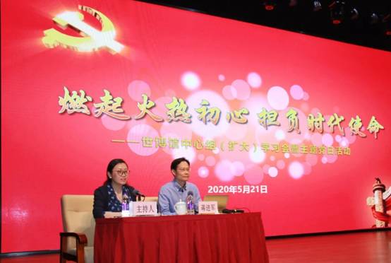 根据市文化旅游局党组“四史”学习教育方案的要求部署,2020年5月21日下午,上海世博会博物馆党总支在WE剧场举行“燃起火热初心,担负时代使命”——世博馆中心组(扩大)学习会暨主题党日活动。会议由馆党总支副书记钟瑞滨主持,馆党政领导班子成员、全体党员、积极分子及群众代表共40余人参加了学习。