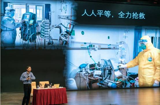 本次学习会特别邀请了上海第一批援鄂医疗队成员、中山医院呼吸科的蒋进军主任医师讲述最美“逆行者”的亲身经历和感人事例。蒋主任和队员们在除夕夜临危受命,是第一批援驰武汉的医疗队,在武汉金银潭医院重症监护室坚守了整整68天。蒋主任从“我们的办法”“我们的诗歌”“我们的摄影”和“我们的病人”四个方面,介绍了他们在金银潭医院发生的故事。