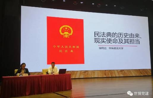 《中华人民共和国民法典》是新中国成立以来第一部以“法典”命名的法律,是新时代我国社会主义法治建设的重大成果,在中国特色社会主义法律体系中具有重要地位。为深入贯彻落实习近平总书记关于广泛开展民法典普法工作的重要指示,积极引导全馆职工养成自觉守法的意识、形成遇事找法的习惯、培养解决问题靠法的意识和能力,2020年9月16日下午,世博会博物馆举行民法典学习专题讲座,邀请黄浦区民法典宣讲团成员、华东政法大学法律学院徐同远博士做《民法典的历史由来、现实使命及其担当》专题报告。世博馆党总支副书记钟瑞滨主持学习会,馆领导班子、党员、入党积极分子和群众参加了学习。