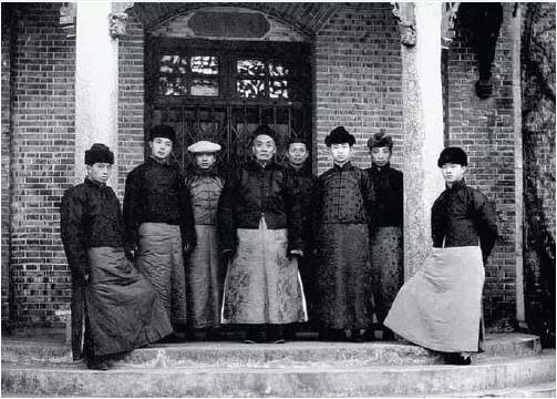▲1920年5月,梅兰芳第二次来南通时,与张謇父子及欧阳予倩在博物苑南馆前合影
