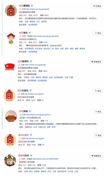 自微博投入运营以来,因前文所述的原因,不断有博物馆加入到微博平台中来,其中故宫博物院已经拥有179万粉丝,中国国家博物馆为165万,是为中国博物馆微博影响力的第一梯队,开通微博的各省博物馆也基本上都有近万乃至于数万粉丝,加上其他的博物馆,今本上形成了一个中国博物馆微博体系。值得注意的是,外国的一些知名博物馆,如卢浮宫博物馆、大都会博物馆、维多利亚与阿尔伯特博物馆,也纷纷在微博上开通了账号。