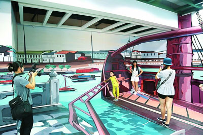 广东省博物馆“牵星过洋”展在地铁里设置的3D海上丝绸之路码头场景画,颇受欢迎。 魏竣摄