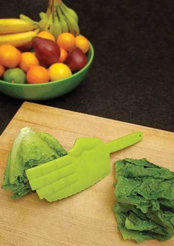 没错,这个巨大的手刀正是让你可以在厨房练习空手道的好法宝!其实这是个切生菜色拉的生菜刀,塑胶材质轻松上手不易伤手,只需要用对力道,生菜们马上“碎尸万段”干净利落分两半。