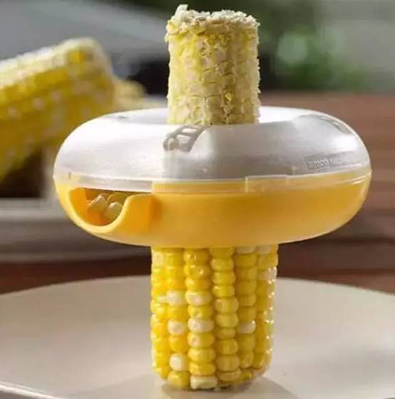 这个玉米切割器看起来很像甜甜圈,中间有一圈切割刀,只要套住玉米往下直撸,就可以享受到甜蜜圆润的玉米粒,比用刀子切还来的省事。