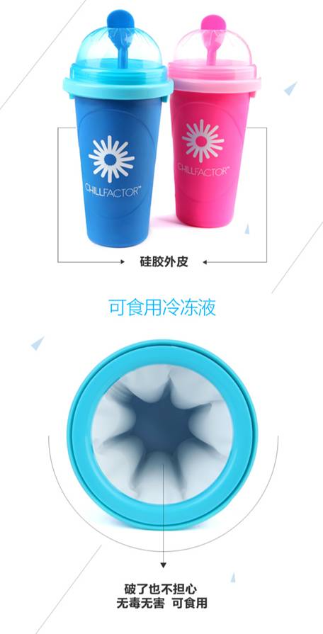 这个沙冰杯整体采用硅胶材质,内部含有冷冻液。先将沙冰杯放入冰箱冷冻4-6小时,然后把准备好的原料,比如果汁、酸奶倒进沙冰杯里。接下来,你就可以对杯子进行惨无人道的蹂躏,不断挤压杯壁差不多一分钟,DIY沙冰就做好了。杯子内部的冷冻液均为可食用液体,即使搓破了内膜让冷冻液流出来了,也不用担心中毒身亡。