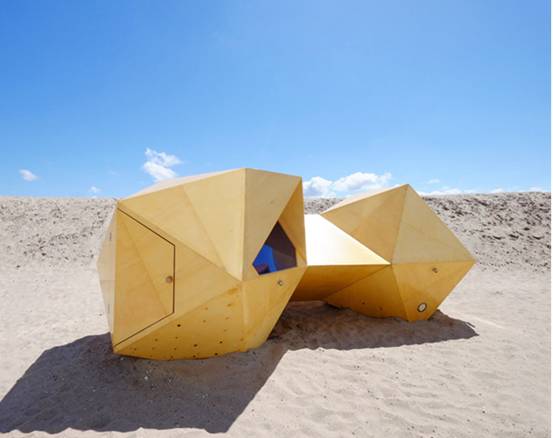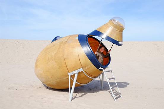 这个营地就像降落在沙地上的生存胶囊。房间里面和外面都可利用,房间里供人休息睡觉,上下左右安装了半球型窗户,确保你的视线无死角;房间外设计了一块区域供休闲,喝点饮料享受生活,下雨下雪都不怕。