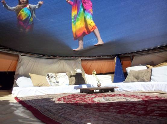 这很像游牧民族的帐篷,但它的屋顶是个蹦床,在里面还可以看到屋顶上玩耍的人。