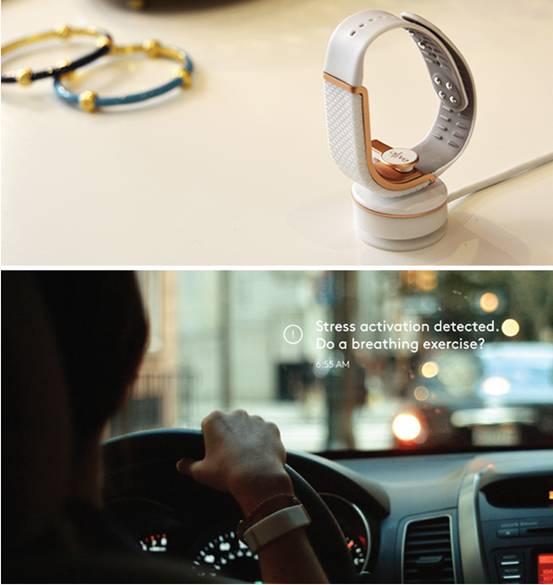 由Zach Sivan与Doron Libshtein设计的WellBe智能手环,采用仿手表设计,利用软木材质,腕带部分用户可以自行更换,它现阶段有黑色,深褐色,原木色三种颜色,手环款式有两种,一种有流动图案,一种没有。在时尚的外表下,WellBe拥有着其他智能手环并不具备的功能:它内置心脏传感器,每个小时会进行 3 分钟的心率监测,在与智能手机上的 APP 相连后,会根据利用特殊算法得到的压力评估,从而给出适合用户的减压建议提醒,让你更好的控制自己的情绪。