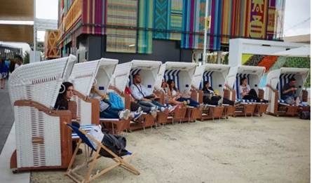 德国馆门口的临时篮子椅,像被颠倒过来的婴儿篮,不得不赞叹德国人的创意~