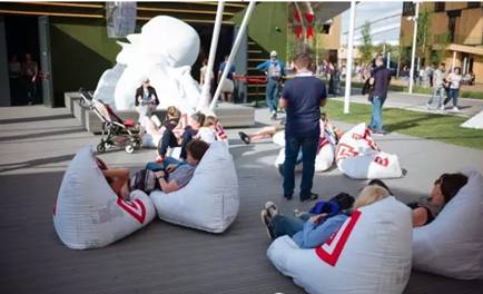 斯洛伐克馆门口的懒人沙发,沙包一样白色沙发椅简直是懒人们的福音,软绵绵的沙发,往上一坐,整个人陷进去,都不想坐起来了。