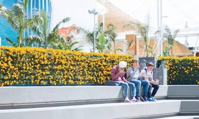 中国馆的胡同阶梯。中国馆前的主通道被勾勒成江河的形态,引导参观者去探究中国的过去、现在和未来;在“江河”的两岸,是生机勃勃的农田;穿插在农田中的疏散通道,似北京胡同,象征中国的独具特色的城市形象。