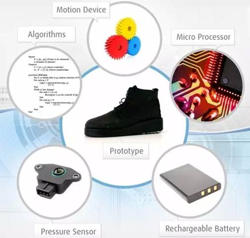 B-Shoe 智能鞋安装有压力传感器、驱动单元、可充电电池、微处理器并且融合了先进的算法。智能鞋后脚跟处内置有履带,当检测到老人身体失去平衡,即将朝后跌倒时,履带就会立即启动,将老人的一只脚向后挪动一些距离,以此来重新获得平衡,好似滑轮鞋。鞋子里安装的超轻的零部件也解除了老人们对于鞋子会重的担忧。