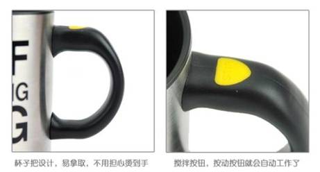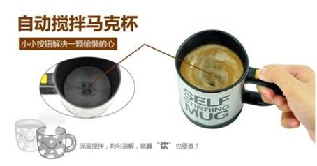 喝咖啡时需要用到一个调羹来搅拌,但有了下面这个自动搅拌马克杯,调羹就再没有用武之地,懒人神器你不容错过。杯子底部装有两节AA电池,调制饮品时只要按下手柄上的开关杯底就会自动旋转搅拌,替代手动搅拌。搅拌的速度均匀适中,绝对不会飞溅出一滴饮品。实际上,欣赏着杯中饮品缓慢地旋转,也是一种很好的享受。