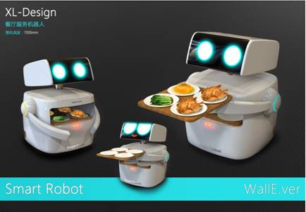 第三种是一种瓦E伊娃化的方案。腹部空间内有滑轮,上扬的手臂处有隐藏式凸棍可将盘子举起。肩膀指示灯会根据状态变色。添加的电子屏可以做出类似小黄人的各种表情。平时在餐厅彼此间也会嘀嘀咕咕低声乱叫增加趣味性。