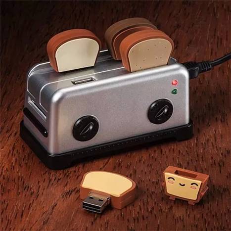 有关U盘的设计可谓是多如牛毛,但在设计U盘造型的同时、配套与之相对应的USB集线器,就要相对少得多。这款ThinkGeek推出的USB面包机集线器与面包U盘就有这样一个套装设计,四片烤到不同程度的面包U盘包分别用了四种可爱有趣的表情来分类,除却尺寸问题外,它们可算得上是称职的潜伏者了。