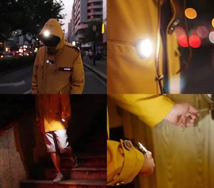 在衣服的袖子上以及其他一些部位添加了具有照明功能的按钮,这些按钮是使用的是高亮度的 LED 灯,并且可以切换三种不同的亮度。另外,如果你想取下来用也是可以,它在不插电的情况下大约可以维持 10 分钟的亮度。