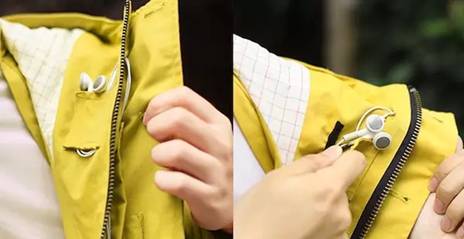 对于入耳式耳机:耳机找不到,找到后缠成一团的问题相信每个人都遇到过。这款夹克完美地将耳机线封存在拉链的位置,不会缠绕在一起,也不会丢失,想听歌的时候只要把手机放口袋里就可以了。