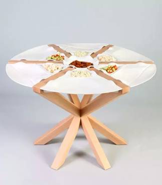这款餐桌如同许多秋千吊在一起,在这样的餐桌上,全家人围起来吃饭,很有趣味,这秋千餐桌把家庭聚餐变成了一种乐趣。