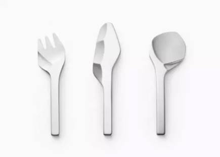 这是日本 Nendo 设计工作室和日本老牌金属制品公司小林工业株式会社联手设计的一款 Sekki 燧石餐具,餐具的样子像是一件艺术品。