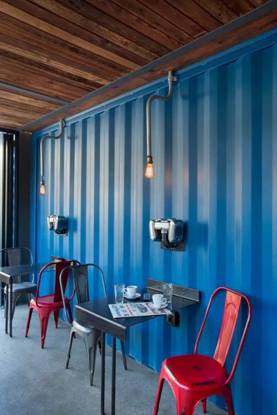 这家咖啡厅和陈列室位于南非,是Earthwoorld Architects利用回收的集装箱提供客户所需要的外观装修。