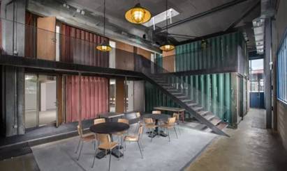 一方面是,集装箱建筑作为咖啡厅,另一方面也是陈列室,这样的组合包括很多设计元素,让冰冷的框架感到温暖,同时也打造了一个产业的吸引力,这就是为什么建筑师选择集装箱的原因。