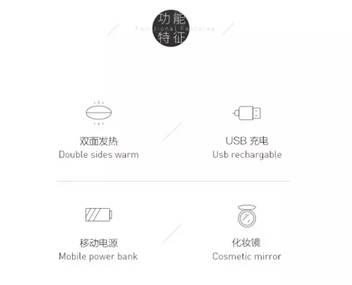这是一个移动暖手宝外加一个 3000 mAh 的移动电源组合体。开关至加热档后就是一个移动的暖宝宝,暖手宝两侧的设计采用了快速导热的材料,癖君试用了一下感觉加热速度很快。打开「贝壳」后是一个小小的化妆镜,满足女生们的日常需求。调至充电档后可为移动设备充电,可谓一物多能。