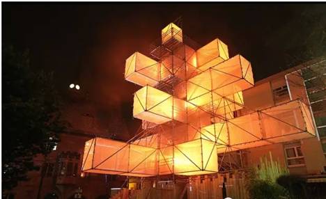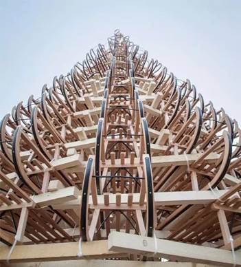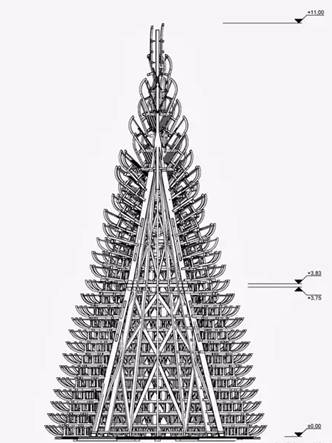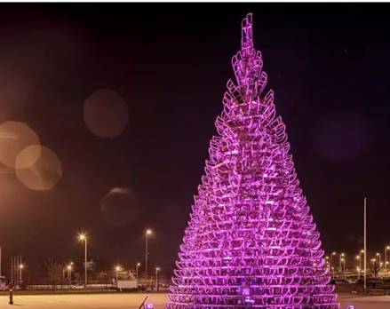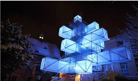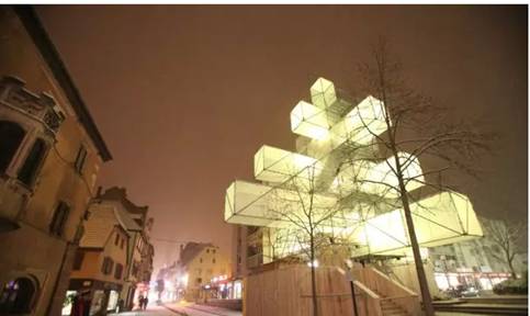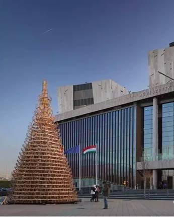 匈牙利建筑师团队Hello Wood设计的圣诞树是由365个雪橇组成的,11m高,被摆放在布达佩斯多瑙河河岸的Palace of Arts前。