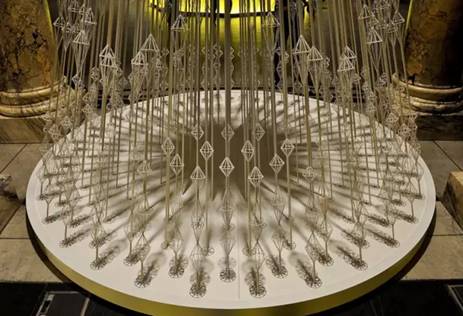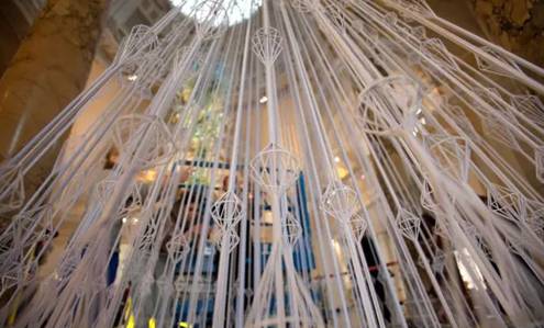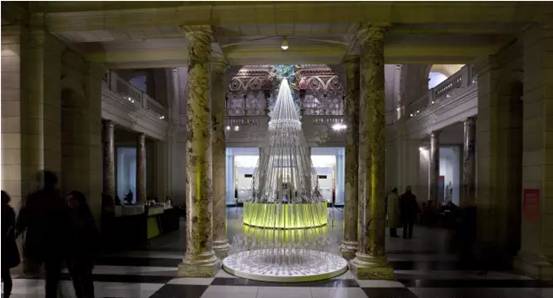 Victoria and Albert Museum 每年都会请不同的艺术家设计博物馆大厅中的圣诞树,Studio Roso设计的2011年度圣诞树是由3.3-mile长,4m高的弹性松紧带组成树的锥体形状。