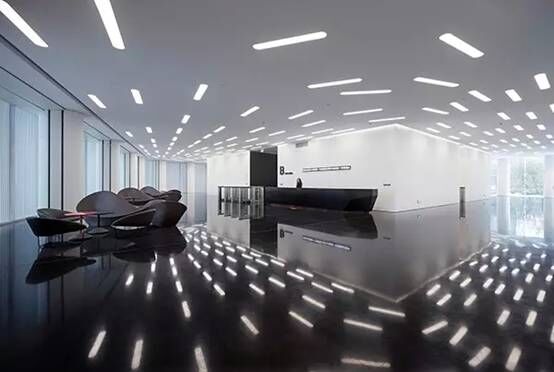 大堂内部通过竖立的三个高度不一的黑色金属柱体,以建筑户外灯光方案形式射向顶部,用球面弧形的天顶形成漫射光,给整体空间提供均匀的照度与柔和的环境照明。汉诺森采用定向生产的特殊规格尺寸铝型材与LED P60显示数字单元,进行合媒,并以半透明树脂片密闭阻隔以形成低照度,柔和的数字信息推送显示效果。汉诺森将信息屏转化为整体建筑皮肤,完整覆盖原建筑立面形成新的结构和立面印象。繁复线性的管材肌理,既使显示单元变为隐性,又大大降低现场大空间的噪音反射,同时给人强烈的科技未来视觉印象。