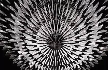 这款由 Lasvit出品的超新星Supernova灯光装置作品由上千片酷似羽翼的半圆形玻璃片衔接而成,整个作品在周围灯光照射下能够从不同角度进行反射,使四周笼罩在绚丽多彩的光影中。随着参观者的运动,内置的交互程序使 Supernova 产生垂直动线上的变化。