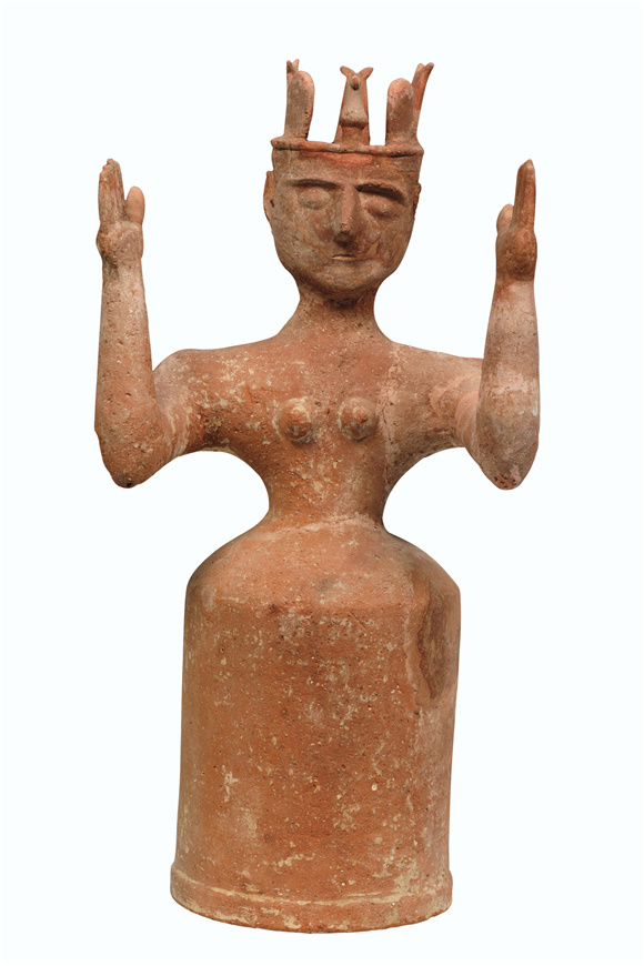女神头部所戴王冠装饰特殊,由三条分叉条纹、两个舌形元素以及一只鸟构成,可能是一种象征符号。推测神像头部的开口可以用来放置头冠或鲜花。王冠上装饰符号的变化,对应着不同的女神形象。此类型雕像普遍被认为是自然女神,或者是女祭司遗留在神圣场所的纪念标志。雕像所展现的扬臂姿态,可能与女祭司在祭祀活动中的舞蹈动作相呼应。另外,从雕像外表遗留的痕迹可以看出,神像原先应该是通体上色的。