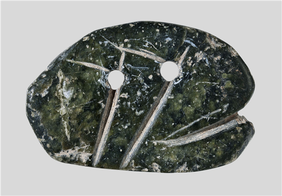 这是一块经过抛光处理的深绿色滑石块,形似一个蜷缩起来的人,或者子宫里的胎儿。石块边缘的V形切口和五条刻痕,勾勒出弯曲的肢体。推测可能用于葬礼习俗,也可能用于祈求顺利分娩。护身符上打了两个洞,可作吊坠使用。